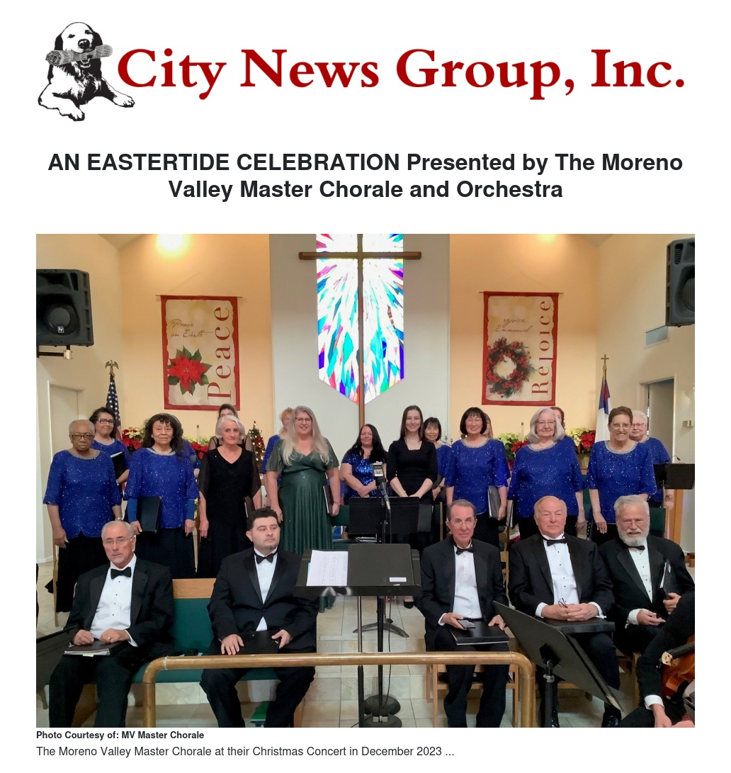 On Sunday, April 7, 2024 at 4:00 P.M., under the talented direction of Dr. Viorel Gheorghe, the Moreno Valley Master Chorale and Orchestra will present “An Eastertide Celebration.” This concert will feature exciting works by a wide variety of composers. These include Wolfgang Amadeus Mozart’s, Ave Verum Corpus; Franz Schubert’s, German Mass; Gabriel Faure’s, Cantique de Jean Racine; Stephen Adam’s, The Holy City; and the beautiful Lamb of God, by Twila Paris. Numbers from George F. Handel’s Easter portion of the Messiah will also be performed. Soloists for this concert will be the world-renowned lyric soprano singer, Camelia Voin, and Stephanie Steele, mezzo soprano. Concert attendees are in for a special treat when Camelia sings, Let the Bright Seraphim from Handel’s Samson Oratorio. In addition, Stephanie will be singing two beautiful inspirational songs, Via Dolorosa by Sprague-Borop and Whole Again by Sally DeFord. The concert will be held at the Shepherd of the Valley Lutheran Church, located at 11650 Perris Boulevard, Moreno Valley, CA 92557. Tickets (cash only) may be purchased at the door. Prices are: Adults -$15.00; Seniors, $10.00. All students will be admitted for free with ID. For more information, please call (951) 485-8414, or (951) 242-4963 or go to the Chorale’s website at: morenovalleymasterchorale.org.