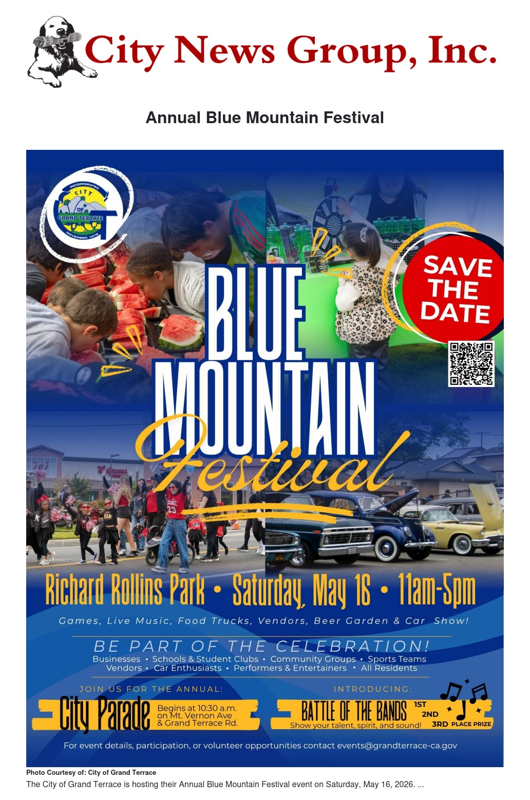 Come with your neighbors, friends, and family for one of Grand Terrace’s most anticipated traditions the Blue Mountain Festival and City Parade on Saturday, May 16, 2026!