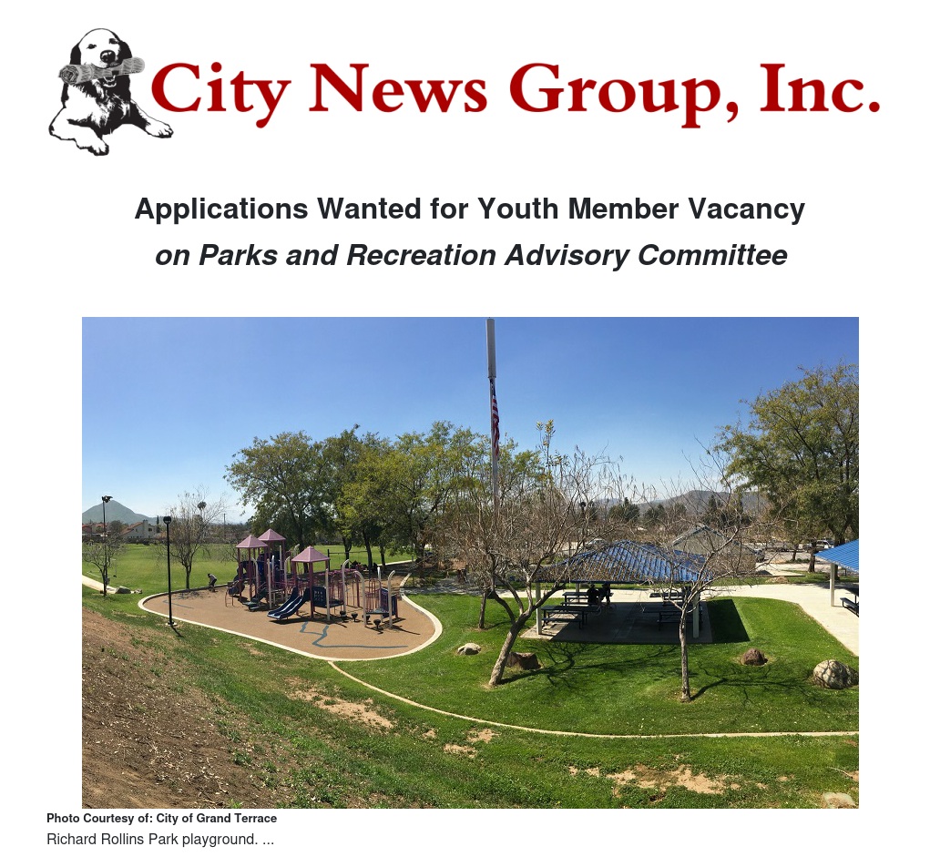 Applications Wanted for Youth Member Vacancy by City of Grand Terrace - City News Group, Inc.
