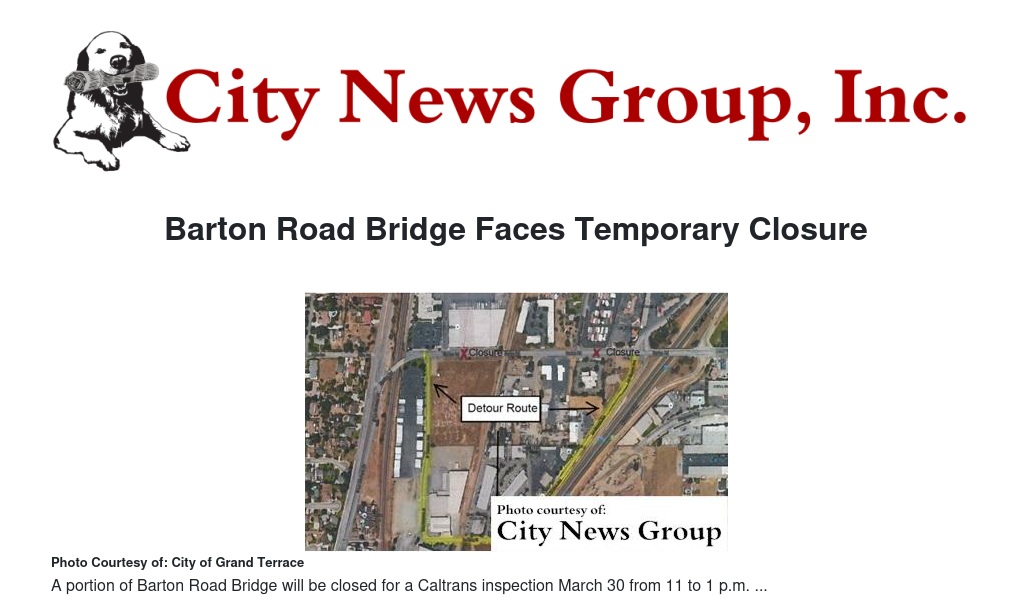 Caltrans will be conducting an inspection of the Barton Road Bridge just west of La Crosse Avenue and Grand Terrace Road on Wednesday, March 30, 2016.