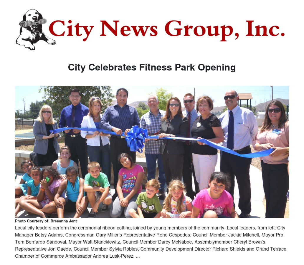 The City of Grand Terrace, said Mayor Stanckiewitz, thanks the Riverside Highland Water Company, Albert A. Webb & Associates, Hamel Contracting, Inc., Jacobsen Family Holdings LLC, the California Department of Parks and Recreation, the California Natural Resources Agency, the Office of the Governor: Edmund G. Brown Jr., the California Housing and Community Development, and park committee members.