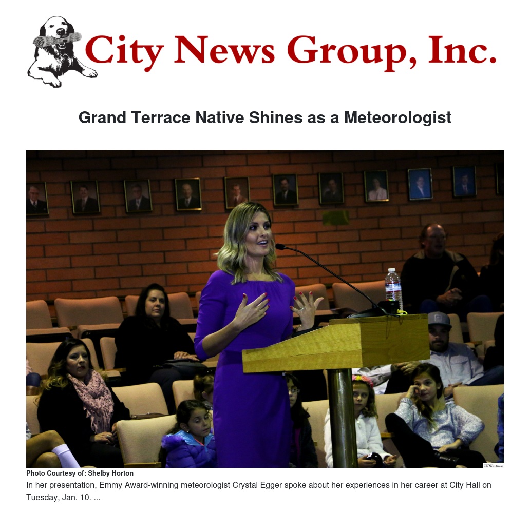 GRAND TERRACE>> Grand Terrace has been experiencing weather patterns and as rain is in the forecast, it is oddly appropriate that the City of Grand Terrace has now recognized city native, NBC Emmy Award-winning meteorologist Crystal Egger.