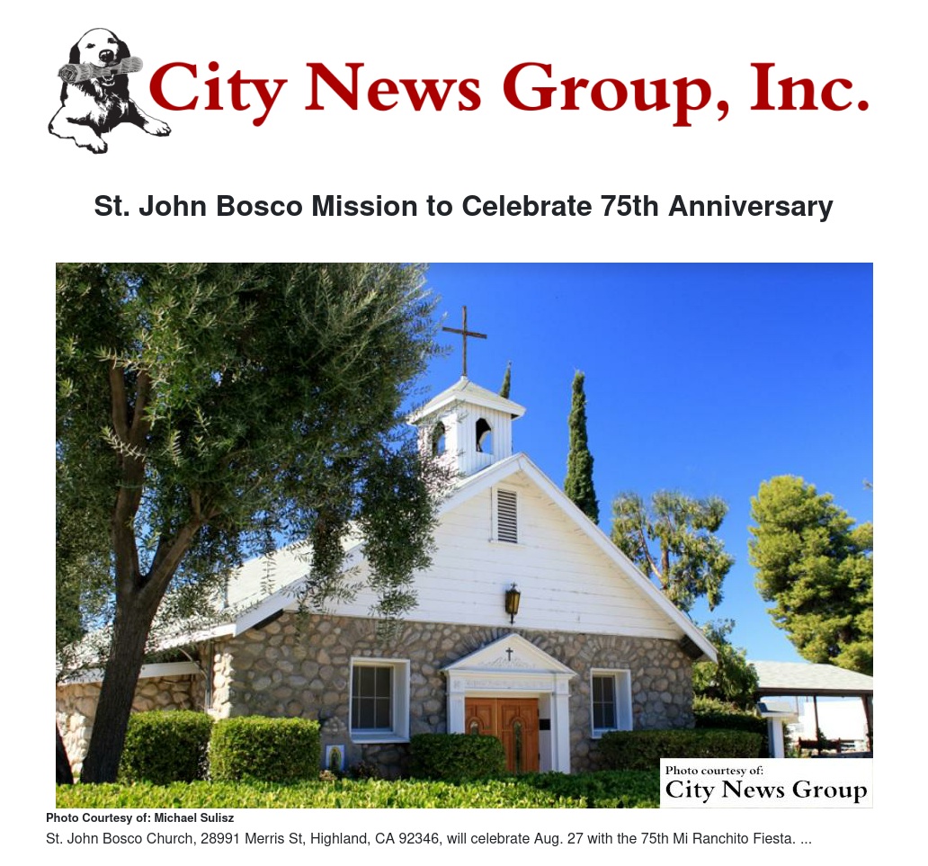 St. John Bosco Historic Mission is located at 28991 Merris Street, Highland. The general public is invited to attend the Aug. 27 festivities. There will also be children’s games with prizes, variety of food booths, special parking lot and a beer garden. For more information call Chavez at 909-862-5680.