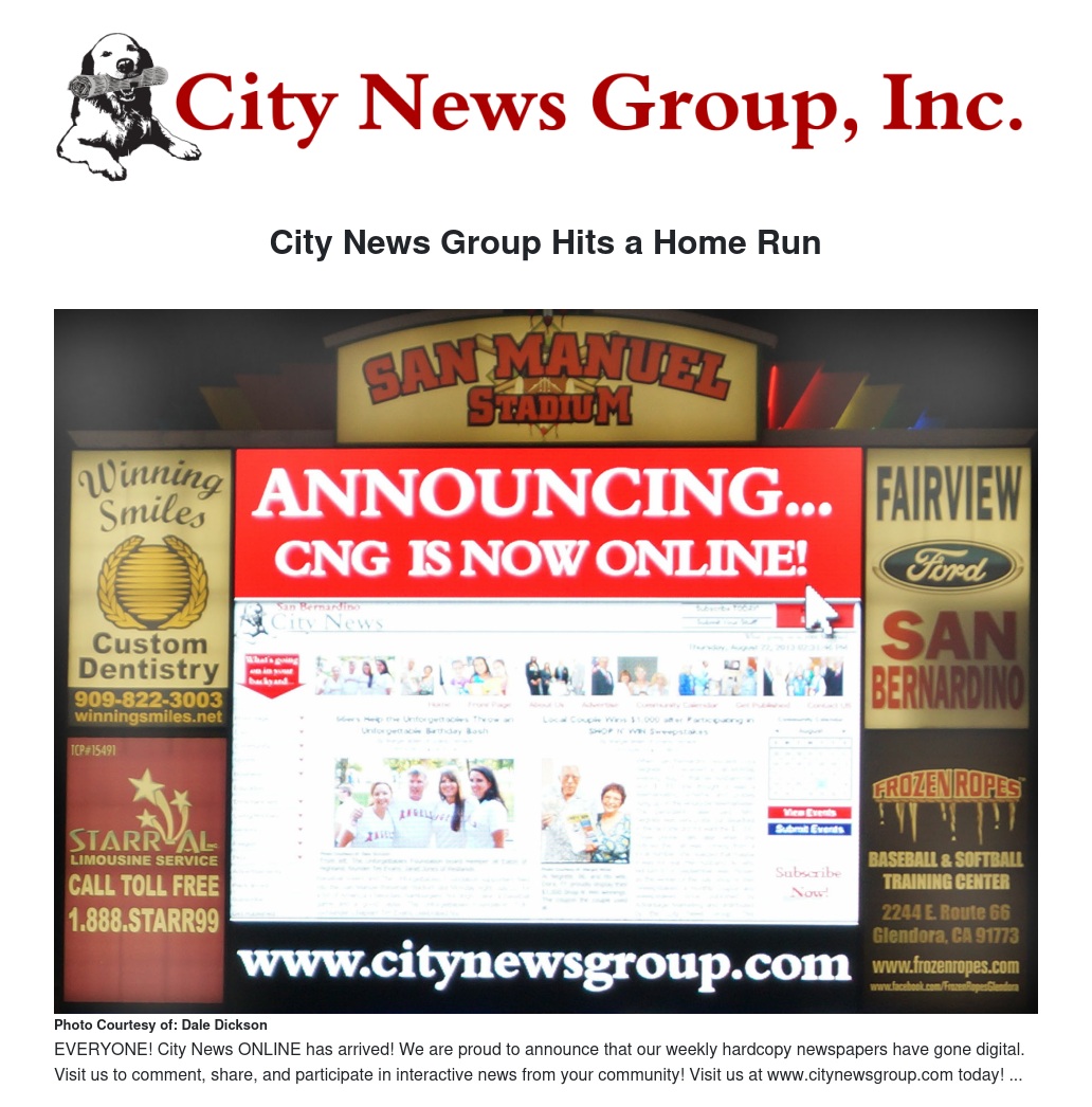 To a packed San Manuel Stadium and a group of over 1,100 CNG supporters come out for a night of fun, camaraderie and baseball, CNG unveiled its latest addition: its new website, to serve its six cities: Colton, Grand Terrace, Loma Linda, Redlands, San Bernardino and Moreno Valley. Finally, the City News Group has its own interactive online presence, complete with social media interaction, a community calendar, a delivery site locater and much more.