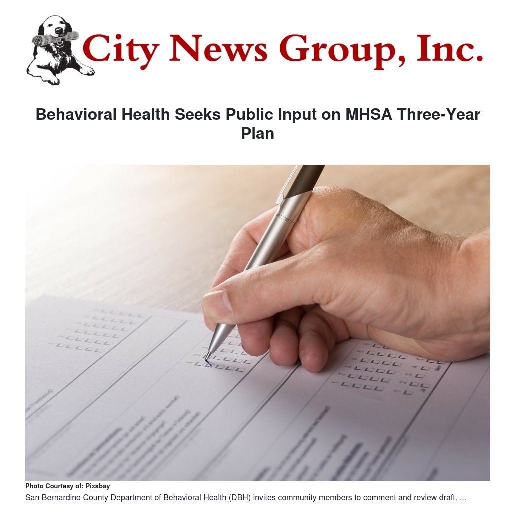 Behavioral Health Seeks Public Input on MHSA Three-Year Plan by Miranda Canseco - City News Group, Inc.