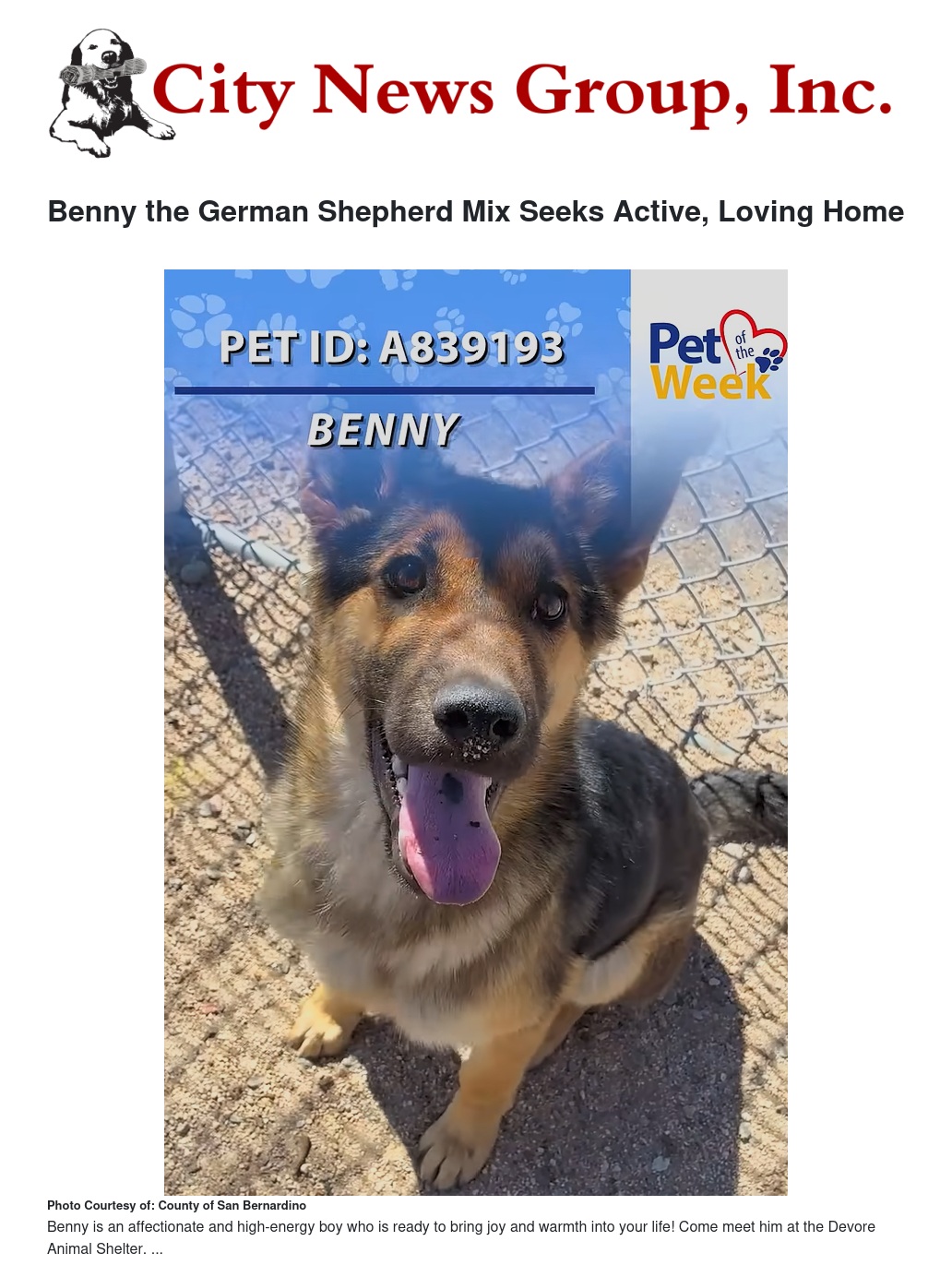 Benny the German Shepherd Mix Seeks Active, Loving Home by Ruby Stephenson - City News Group, Inc.
