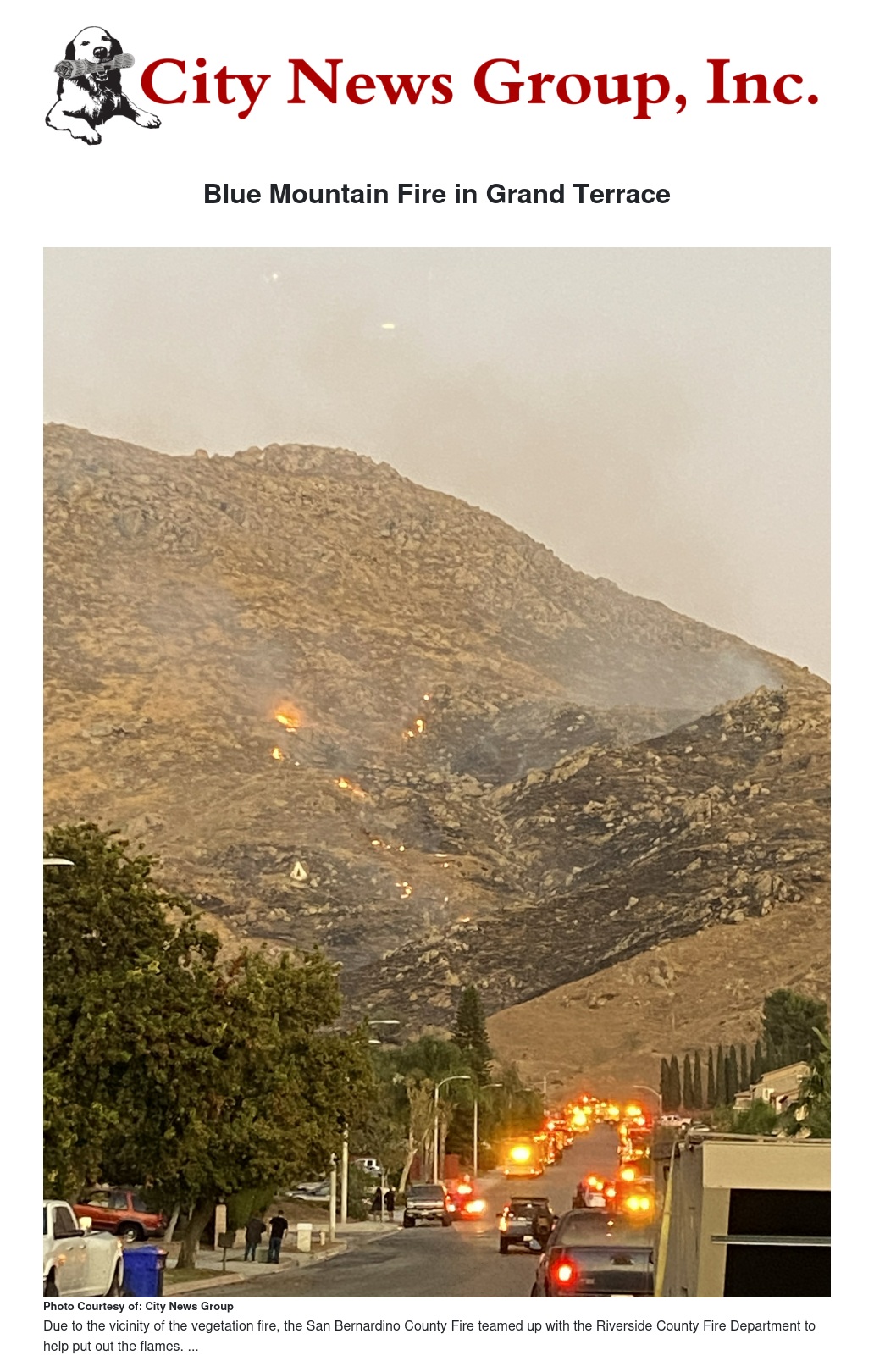 At the time of reporting, 4:52 pm, the San Bernardino County Fire announced that the fire had burned 2.5 acres of Blue Mountain and was 0% contained. Due to the vicinity of the vegetation fire, the San Bernardino County Fire teamed up with the Riverside County Fire Department to help put out the flames.