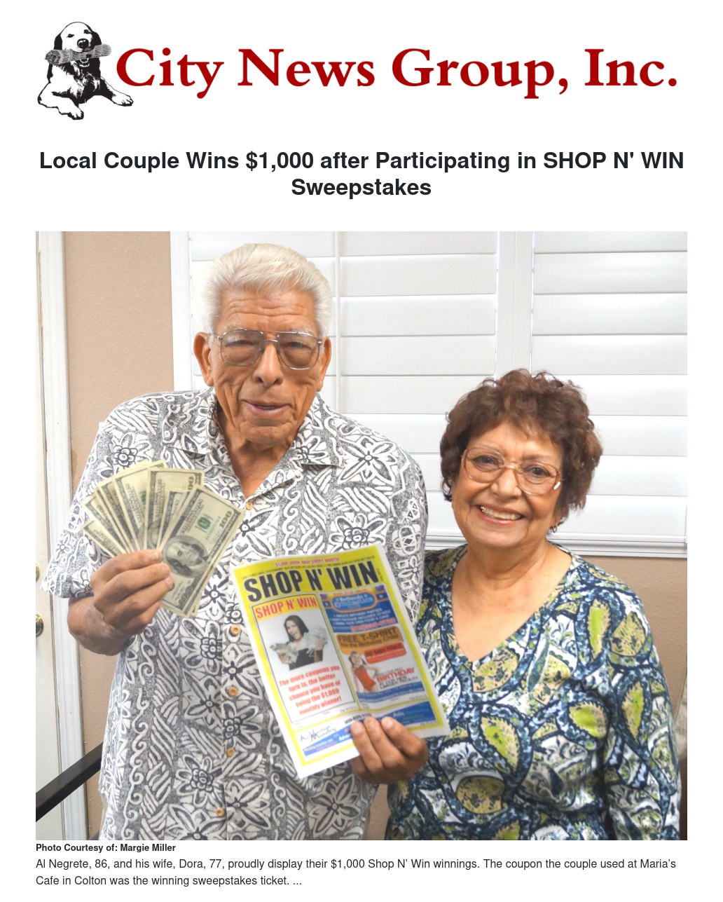 During an afternoon lunch at Maria’s cafe, Al used the coupon, and on Tuesday, Aug. 6, received his cash reward at the City News Group offices in Grand Terrace. He said he planned to celebrate by taking his family (the couple has six children and fifteen grandchildren) out to dinner for the occasion. They will possibly dine on seafood, which Al shared is their favorite.
