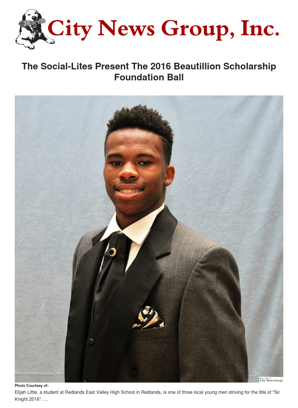 The Beautillion Scholarship Foundation Program has been sponsored by the Social-Lites of San Bernardino for 49 years. The Beautillion Scholarship program provides an opportunity for outstanding college-bound young men to participate in a series of leadership and organizational activities that prepare them to challenge their future success. The participants have also been exposed to a variety of Community, Charitable, and Social Events that begin in October 2015 and will conclude at the Beautillion Scholarship Foundation Ball on April 2, 2016.