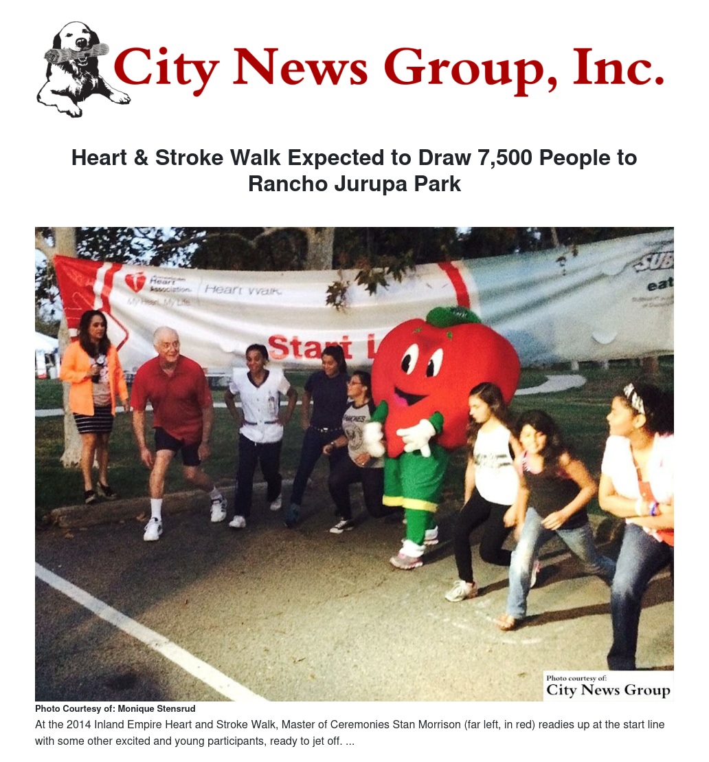 The American Heart Association’s (AHA) Inland Empire Division will host its annual Inland Empire Heart & Stroke Walk on Saturday, Sept. 19 at Rancho Jurupa Park, where an estimated 7,500 people will lace up their sneakers and make lifesaving strides.