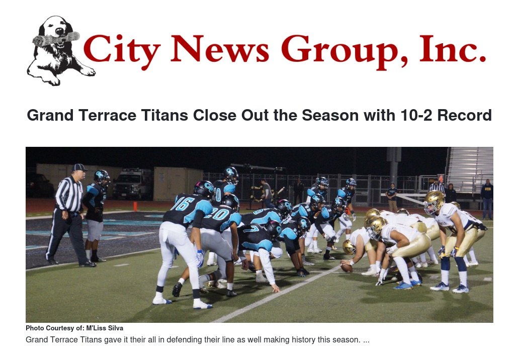 The Grand Terrace High School 2017 season came to a close on Friday, November 17, as the Titans lost to the Quartz Hill Rebels 36-13 in the CIF-SS Division 10 quarter-finals. Both the Titans and the Rebels were equally matched, boasting records of 10-1 in their respective leagues.