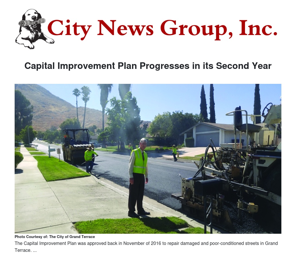 The CIP was created after Public Works Director Yanni Demitri took an Interwest Consulting pavement management index study, which included inspecting all public Grand Terrace streets and street frontages and giving each city street a rating based on street condition, and prepared a 5-year paving plan that would improve and repair damaged and poor-conditioned streets in Grand Terrace.