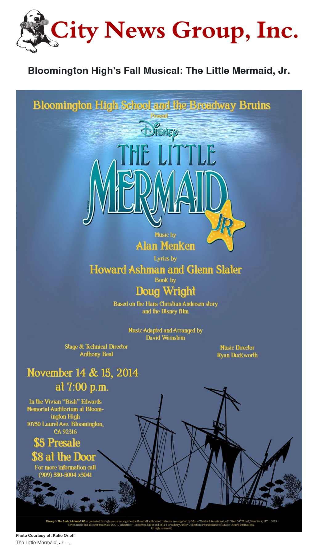 Bloomington High School and the Broadway Bruins are proud to present The Little Mermaid, Jr. on Nov. 14 and 15 at 7 p.m. in the Vivian “Bish” Edwards Memorial Auditorium at Bloomington High School at 10750 Laurel Ave. in Bloomington.