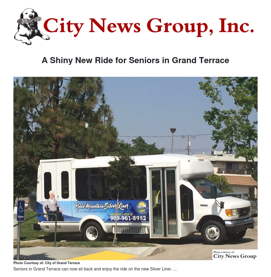 GRAND TERRACE >> The first day of service for the Grand Terrace Silver Liner was May 17. The Silver Liner will provides transportation to the Grand Terrace Senior Center from any location in Grand Terrace. The Senior Center offers a wide variety of activities for seniors each day including a nutrition programs and lunch. Donations for the lunch are three dollars for those over 60 years of age and five dollars for those under 60. Donations are 50 cents.