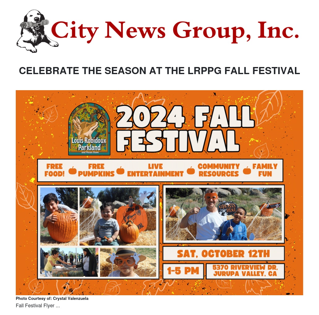 The second annual Fall Festival will take place at the Louis Robidoux Parkland and Pecan Grove (LRPPG) on Saturday, October 12, 2024, from 1:00 PM to 5:00 PM at 5370 Riverview Dr., Jurupa Valley, CA 92509. This free, family-friendly event invites community members of all ages to celebrate the fall season with an afternoon of fun, food, and lively entertainment.