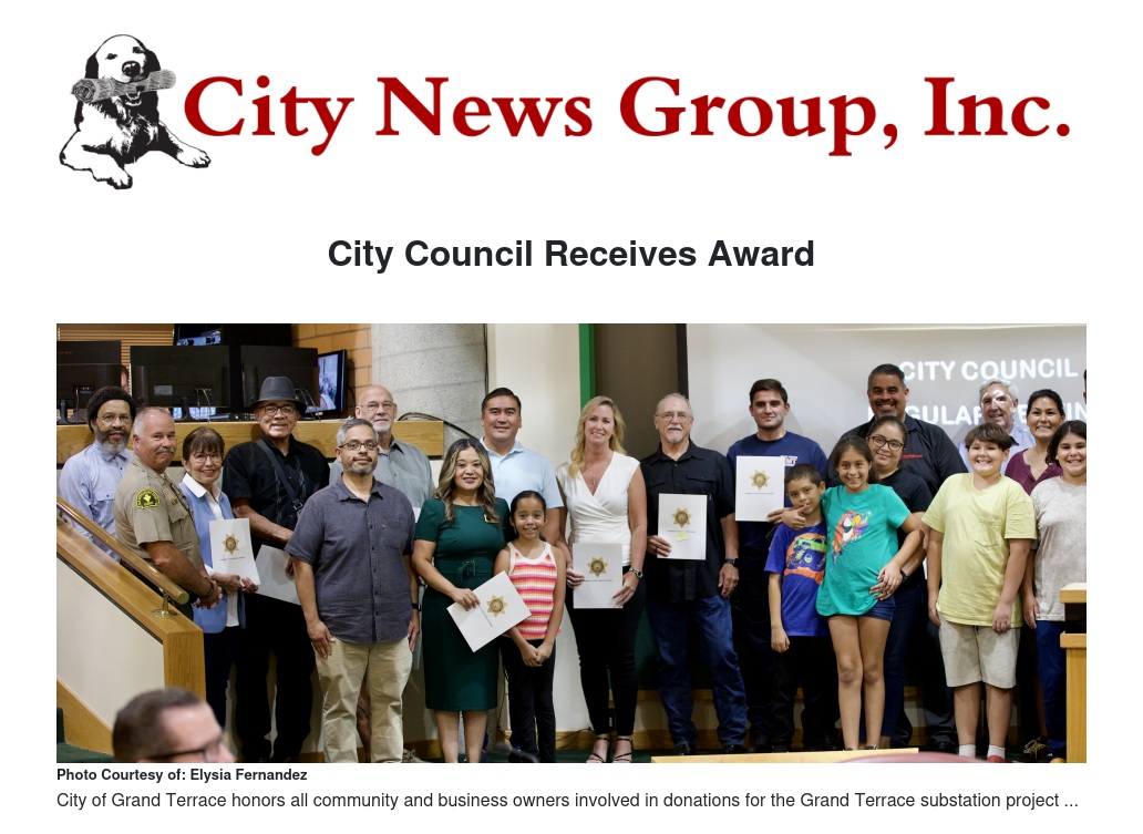 Johan Gallo along with other communities Members and businesses, such as Get Loaded , Cars and Coffee. City News Group, and many others were honored and thanked for their involvement, donations and help with the building and completion of the renovations to the Grand Terrace substation