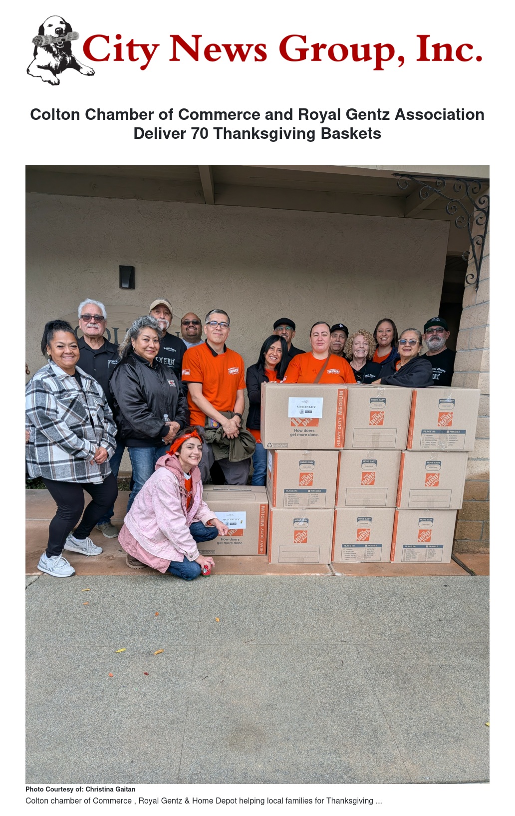 The Colton Chamber of Commerce, in partnership with the Royal Gentz Association, proudly delivered 70 Thanksgiving baskets to seven schools within the Colton Unified School District. Each school selected ten families to receive a basket, ensuring that households in need were supported during the holiday season.