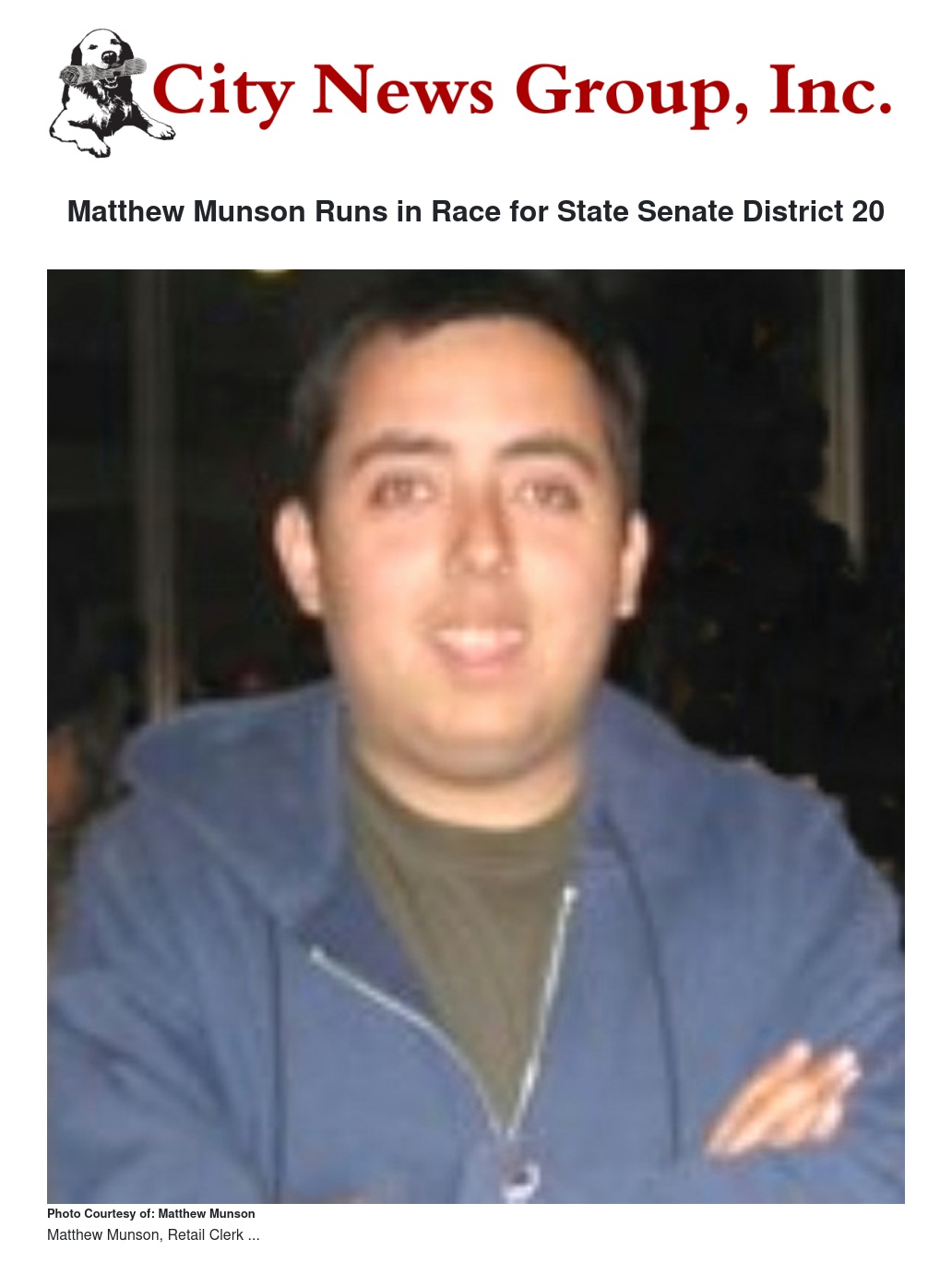 Ontario resident Matthew Munson is running for the seat to represent California’s 20th State Senate district on the November 2014 ballot.