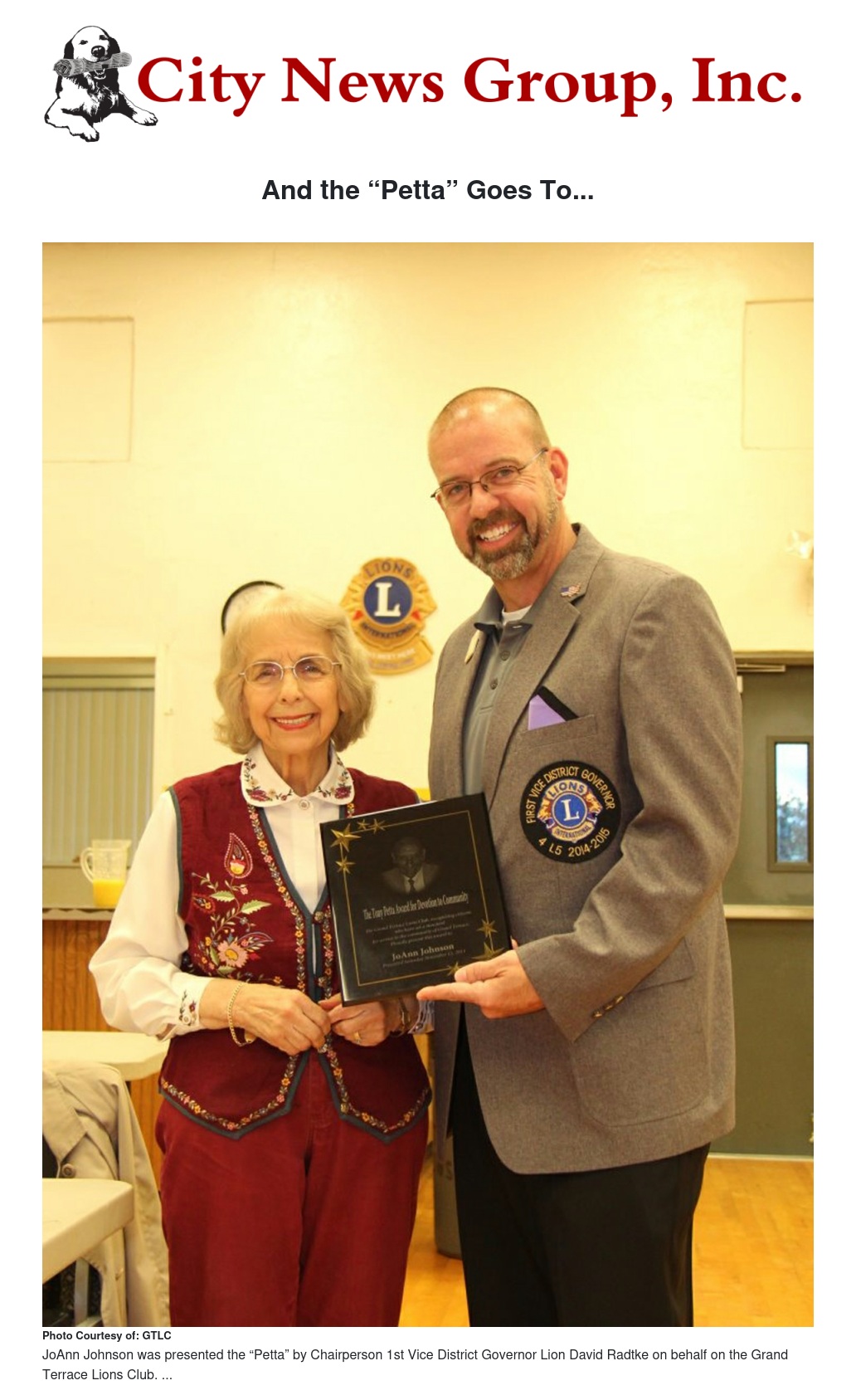 The Grand Terrace Lions Club is proud to award JoAnn Johnson the 2014 “Petta” award.