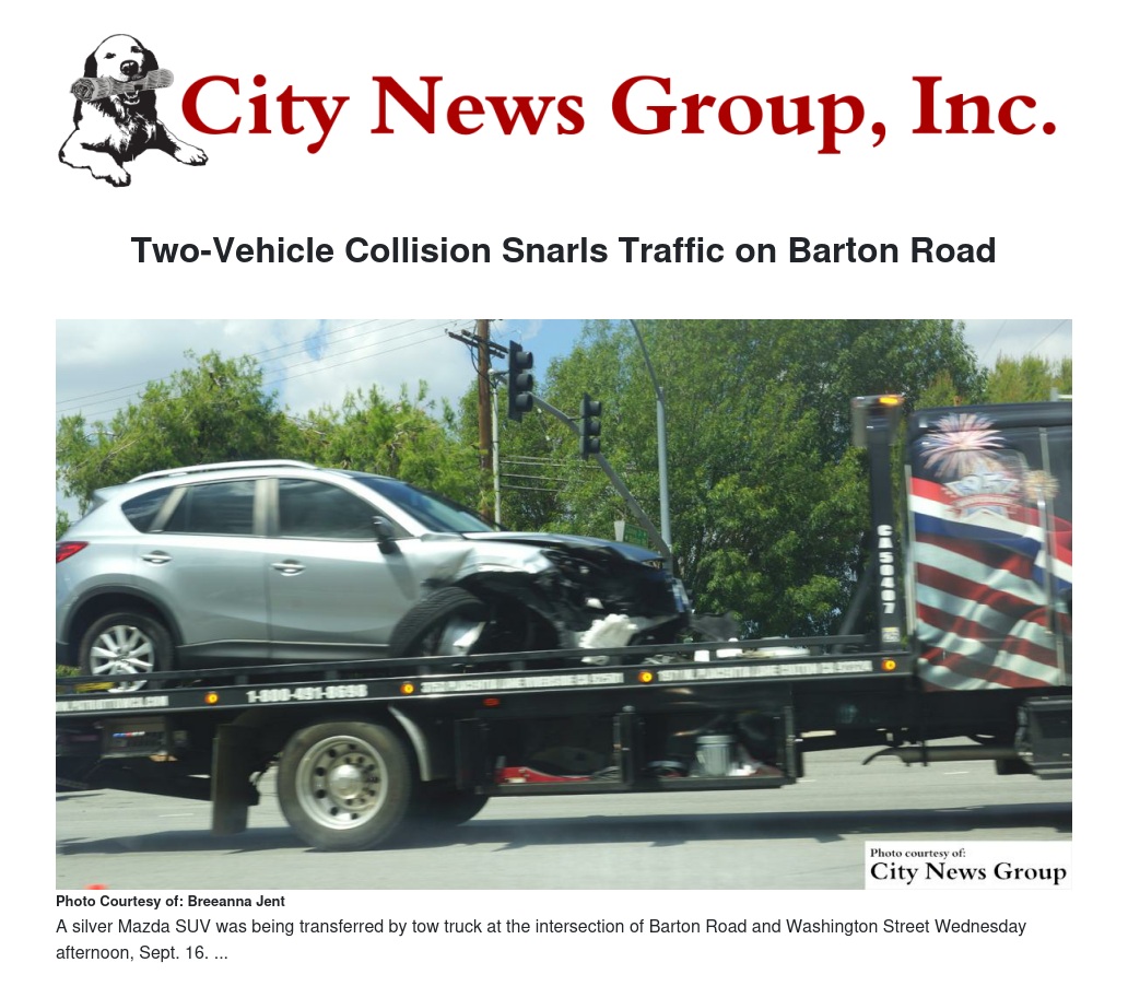 Colton police officers were on scene at the intersection of Barton Road and Washington Street in Colton after the crash occurred at Washington Street and Cooley Avenue, stated Cpl. Ray Mendez of the Colton Police Department. Mendez reported the incident occurred at 12:33 p.m. between a black Cadillac Seville and a silver Mazda SUV.