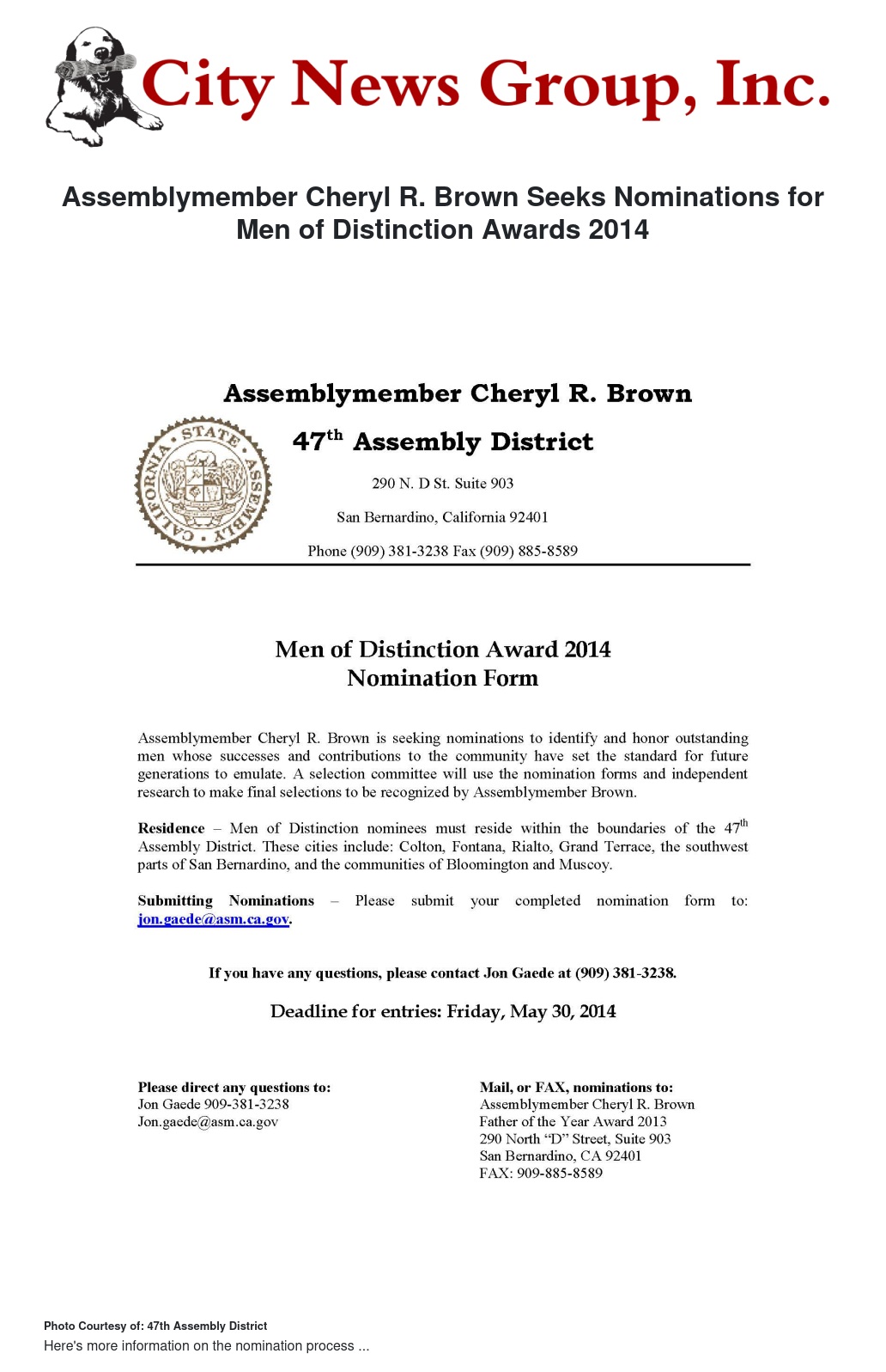 Assemblymember Cheryl R. Brown (D-San Bernardino) is seeking nominations to identify and honor outstanding men whose successes and contributions to the 47th Assembly District have set the standard for future generations to emulate. A selection committee will use the nomination forms and independent research to make final selections to be recognized by Assemblymember Brown.
