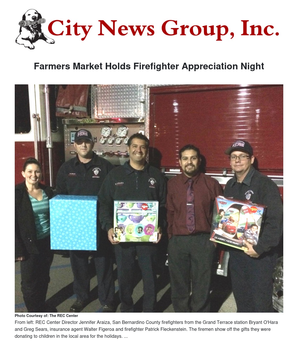 Firefighters from two counties came out to the Grand Terrace Market night on Nov. 26, to join Farmer's Insurance Agent Walter Figeroa for Firefighter Appreciation Night.