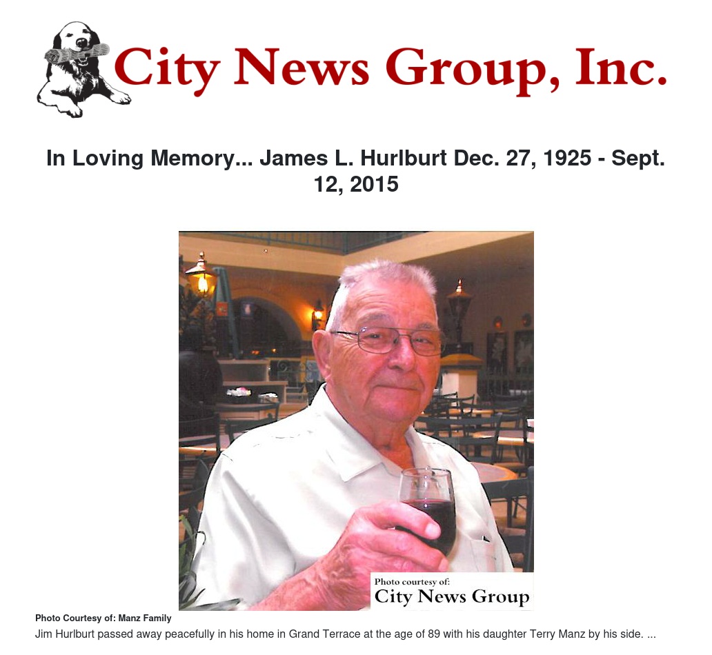 Jim Hurlburt passed away peacefully in his home in Grand Terrace at the age of 89 with his daughter Terry Manz by his side. Jim was born in Downey, California and moved to Grand Terrace in 1962 while stationed at Norton Air Force Base.