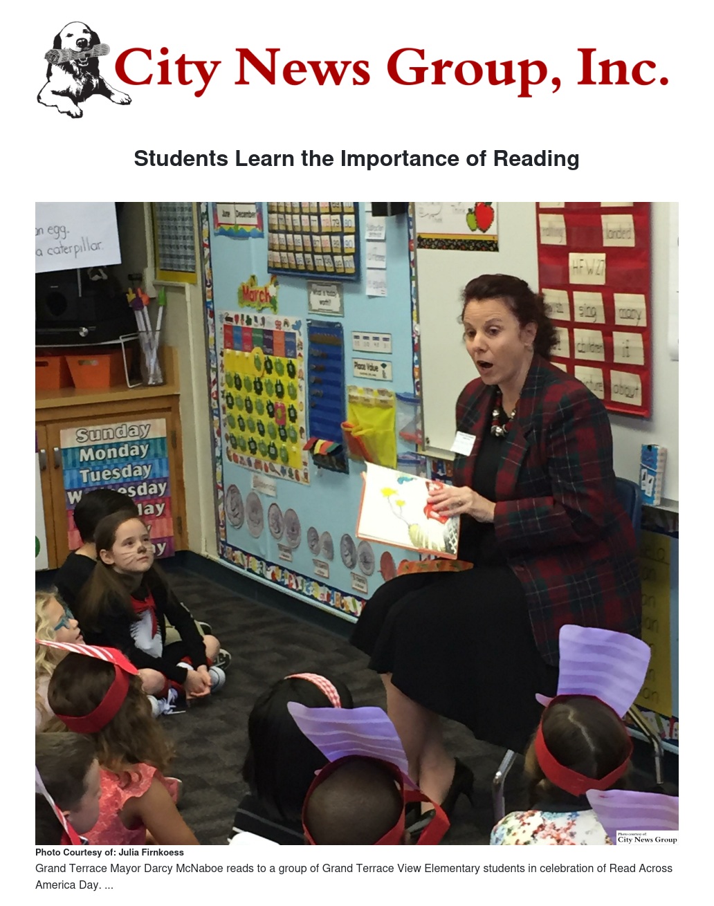 Guests focused on the importance of learning to read and shared their experiences with the young students at the elementary school. Julia Firnkoess, Grand Terrace resident, stated that the city is lucky to have the mayor, first responders and high school students come to do peer-to-peer modeling for the students.