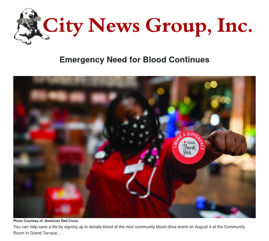 The American Red Cross is urging all healthy individuals to schedule an appointment to give blood or platelets. The August 4th blood drive event will take place at the community room 22795 Barton Road, Grand Terrace, CA 92313.