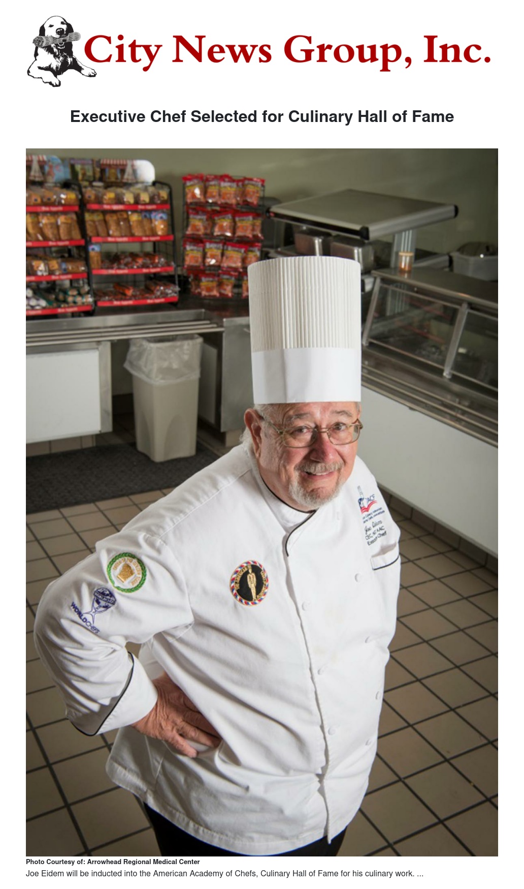 Arrowhead Regional Medical Center Executive Chef, Joe Eidem, has been selected for induction into the American Academy of Chefs, Culinary Hall of Fame for 2018. This is the highest honor bestowed by the American Academy of Chefs (AAC). Chef Eidem earned this award for his continued support of the culinary profession, the American Culinary Federation (ACF) honor society, and its mission statement.