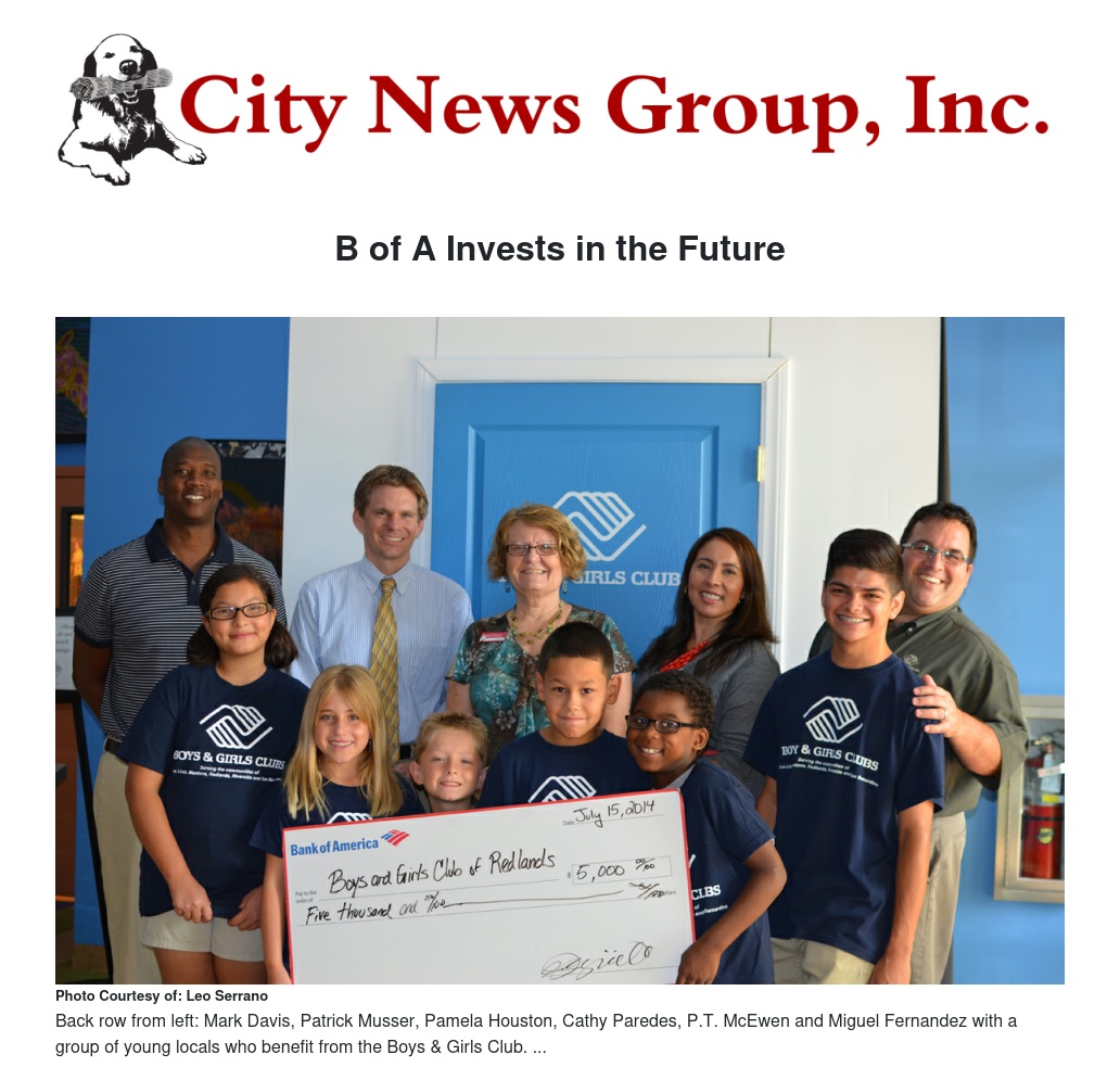 Patrick Musser, the vice president of Small Business Bankers, along with Pamela Houston, the senior vice president of Banking, and Cathy Paredes, the vice president of Global Marketing and Corporate Affairs, presented the Boys & Girls Clubs of Greater Redlands and Riverside with a grant for $5,000 to support one of their key programs, the Job Readiness program.