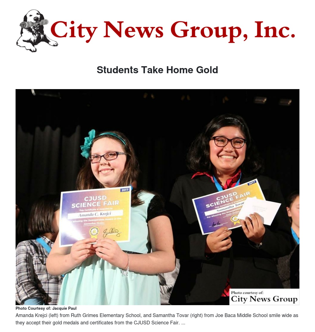 A total of 39 students from CJUSD took home gold medals from the science fair. In grades fourth through fifth, the winners were Christopher Gomez, Luis Rodrigues and Santos Rios from Alice Birney Elementary School; Keira Strahan from Cooley Ranch Elementary School; Emma Ponce from Grand Terrace Elementary School; Norissa Rendon from Grant Elementary School; Amanda Krejci from Ruth Grimes Elementary School; Edward Rodriguez from Jurupa Vista Elementary School; and Zoe Lopez Forsythe and Ashmina Griffith from Reche Canyon Elementary School.