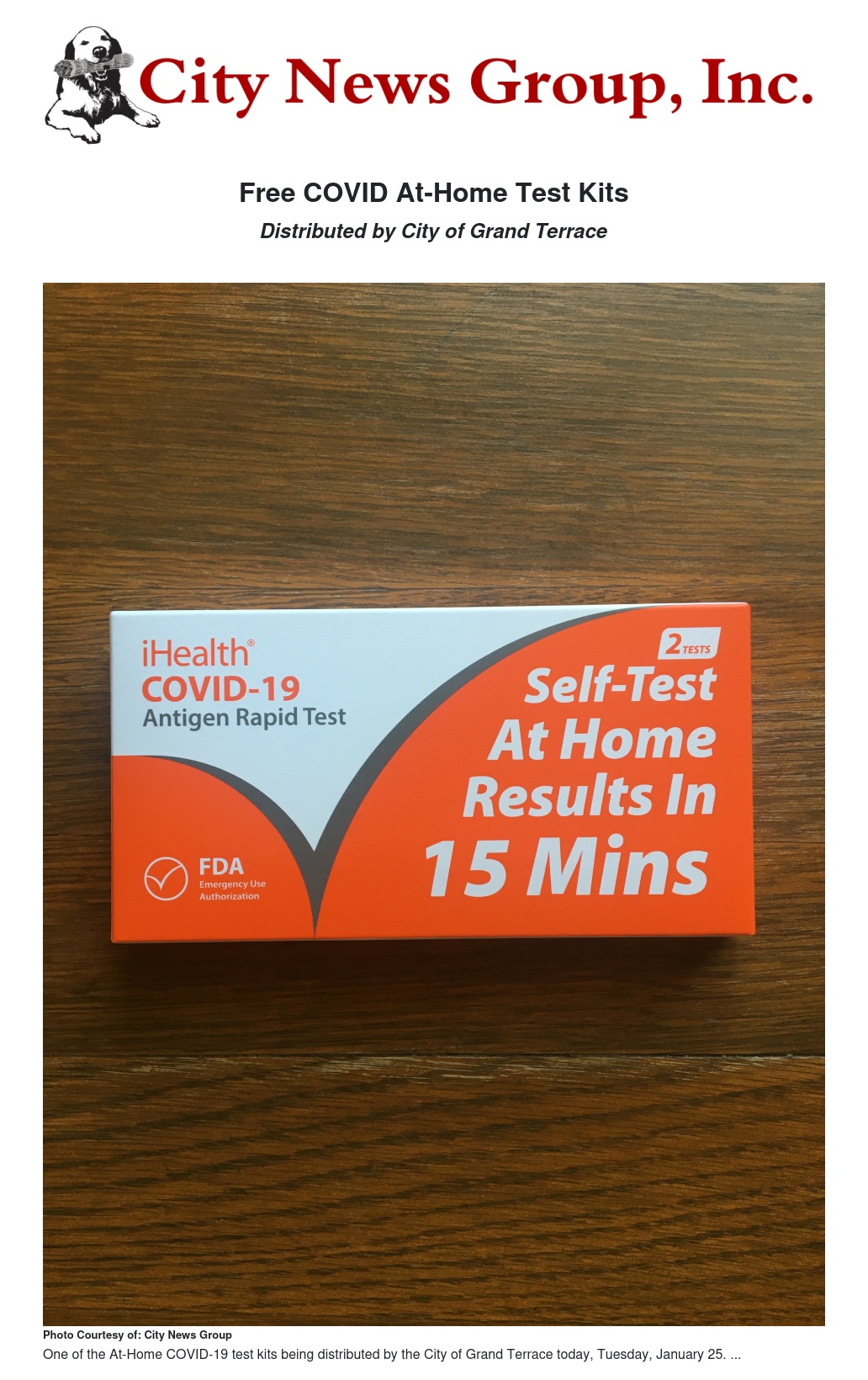 On Tuesday, January 25, 2022, beginning at 9:00 a.m., the City of Grand Terrace will once again be distributing free COVID At-Home Test Kits while supplies last. City Hall is located at 22795 Barton Road, Grand Terrace, CA. One (1) Test Kit Per Family Member will be distributed. For any questions regarding this drive-thru event, please call (909) 8243-6621 ext. 212.
