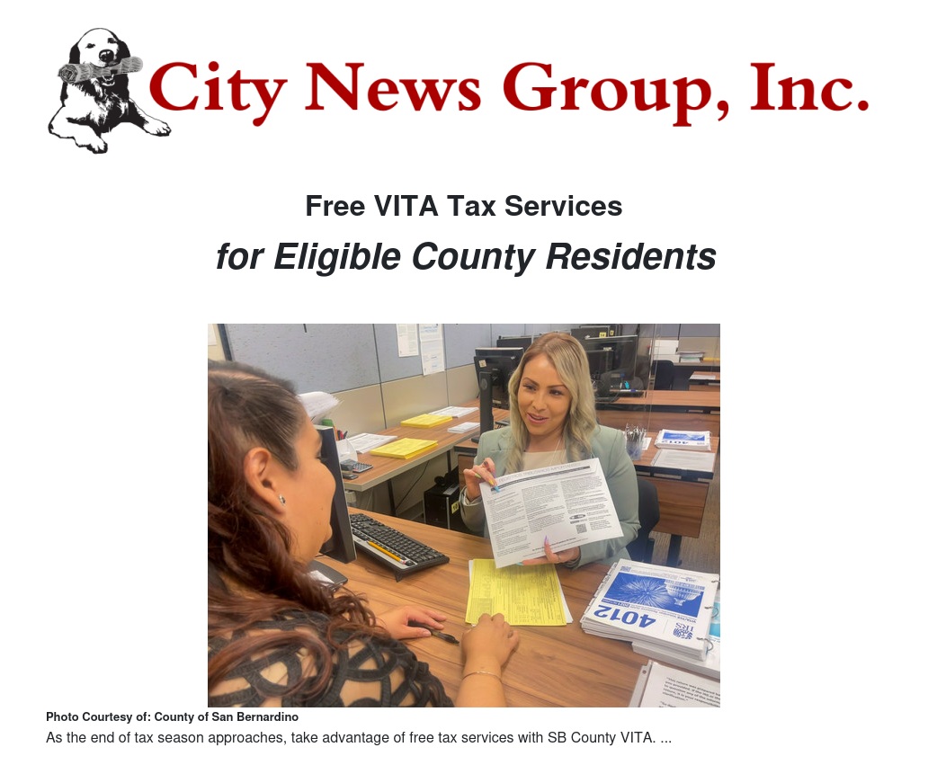 Eligible individuals and families whose combined household earned income was less than $58,000 in 2021 can still schedule appointments for free tax services until April 18 at various offices throughout the county. For more information, contact https://wp.sbcounty.gov/tad/resources/ or call 909-421-4091.