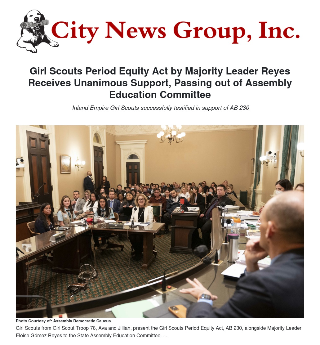 Girl Scouts Period Equity Act by Majority Leader Reyes Receives Unanimous Support, Passing out of Assembly Education Committee by Sarah Wells - City News Group, Inc.