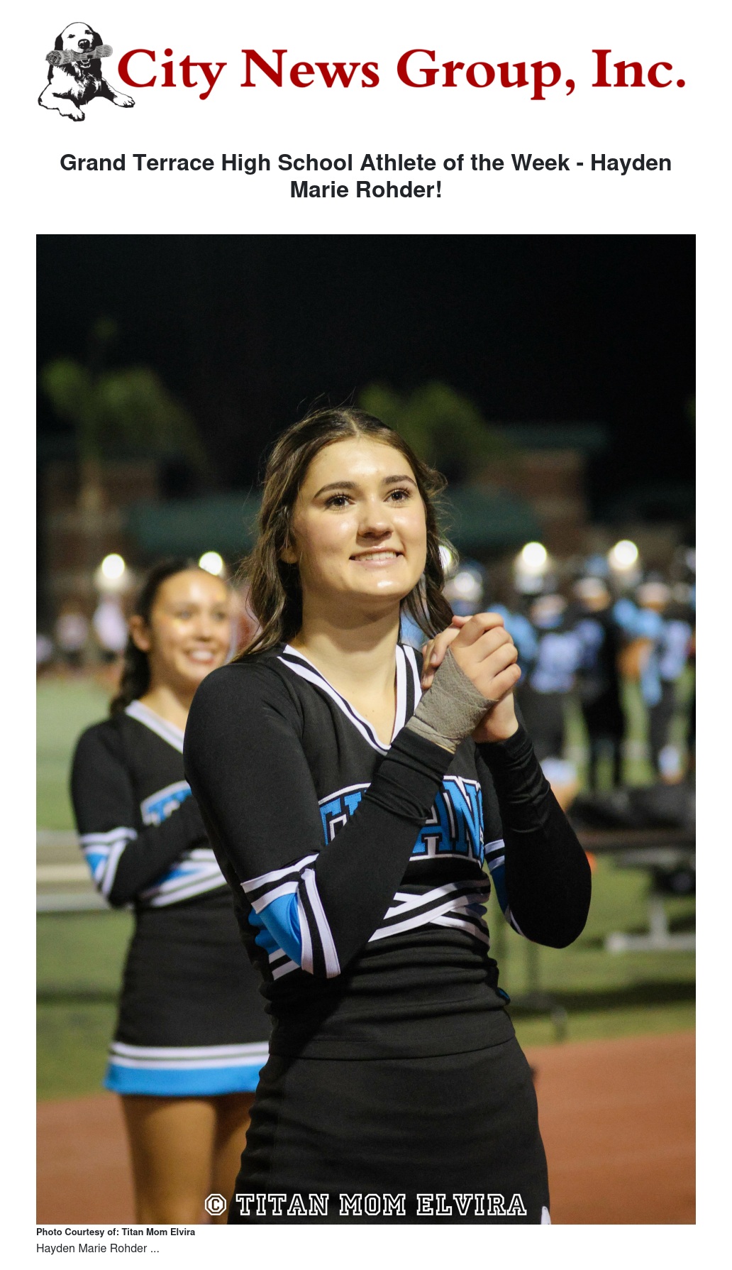 This week's Grand Terrace High School Athlete of the Week is Hayden Marie Rohder!