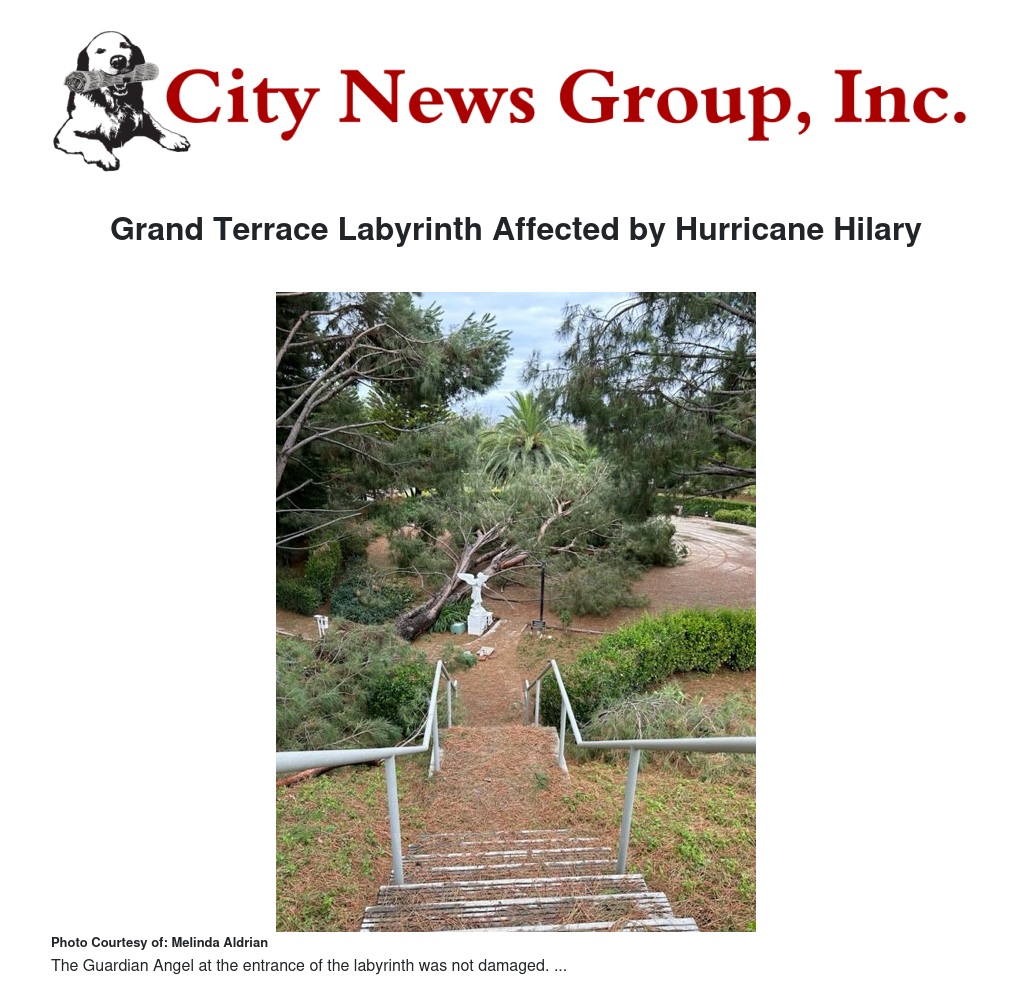 Over the weekend of August 19-20, the labyrinth was affected by Hurricane Hilary, a tropical storm that went through Southern California. The storm devastated the labyrinth and parking lot. "We are so grateful that the Guardian Angel at the entrance of the labyrinth was not damaged," said Sister Sasse.