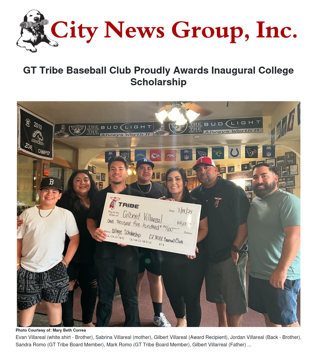 "We are beyond proud to present our inaugural college scholarship tonight to Gilbert Villareal," said Mark Romo, President of GT Tribe Baseball Club. "Gilbert's hard work and dedication inspire us all. We are excited to support his educational journey and look forward to seeing his future accomplishments."
