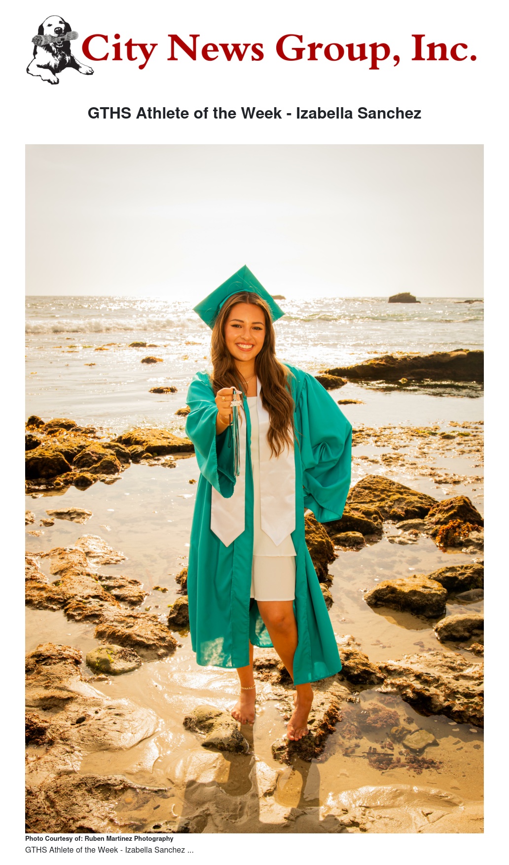 Her accomplishments in the water are nothing short of remarkable. As a Sophomore, she qualified for CIF in the 200 Individual Medley (IM). In her Senior year, she dominated at Finals, earning 1st place in the 100 Breaststroke, 200 IM, and anchoring the 200 Freestyle Relay to victory. For her achievements, Izabella was named the Citrus Belt Area Female Athlete of the Year, Ken Hubbs Female Athlete of the Year at GTHS, and received the Silver Medal Award for academic excellence.