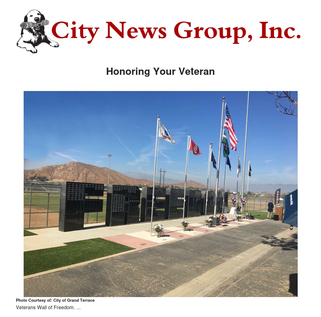 The Veterans Wall of Freedom is a committee of the Foundation of Grand Terrace. For more information on the reserving a plaque or the Veterans Wall of Freedom, please visit veteranswalloffreedom.org or contact Don Larkin at 951-756-4711.