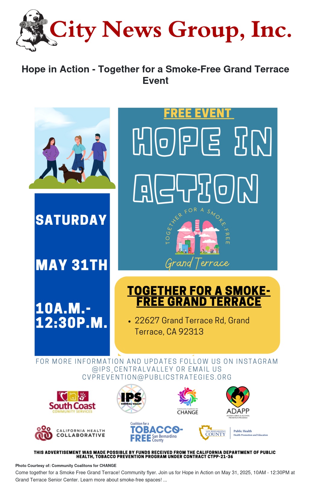 Join us for the Hope in Action event on May 31, 2025, at the Grand Terrace Senior Center, located at 22627 Grand Terrace Rd, Grand Terrace, CA 92313, from 10:00 a.m. to 12:30 p.m. This free community event is focused on raising awareness about the importance of clean, healthy outdoor spaces in Grand Terrace. Hosted by the Community Coalition for CHANGE, the event supports the Smoke-Free Grand Terrace Campaign—a community-led effort to educate the public on the health and environmental dangers of tobacco and cannabis smoke in public areas.