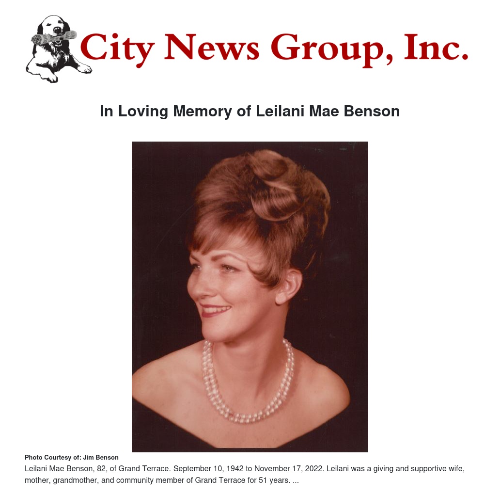 In Loving Memory of Leilani Mae Benson by Margie Miller - City News Group, Inc.