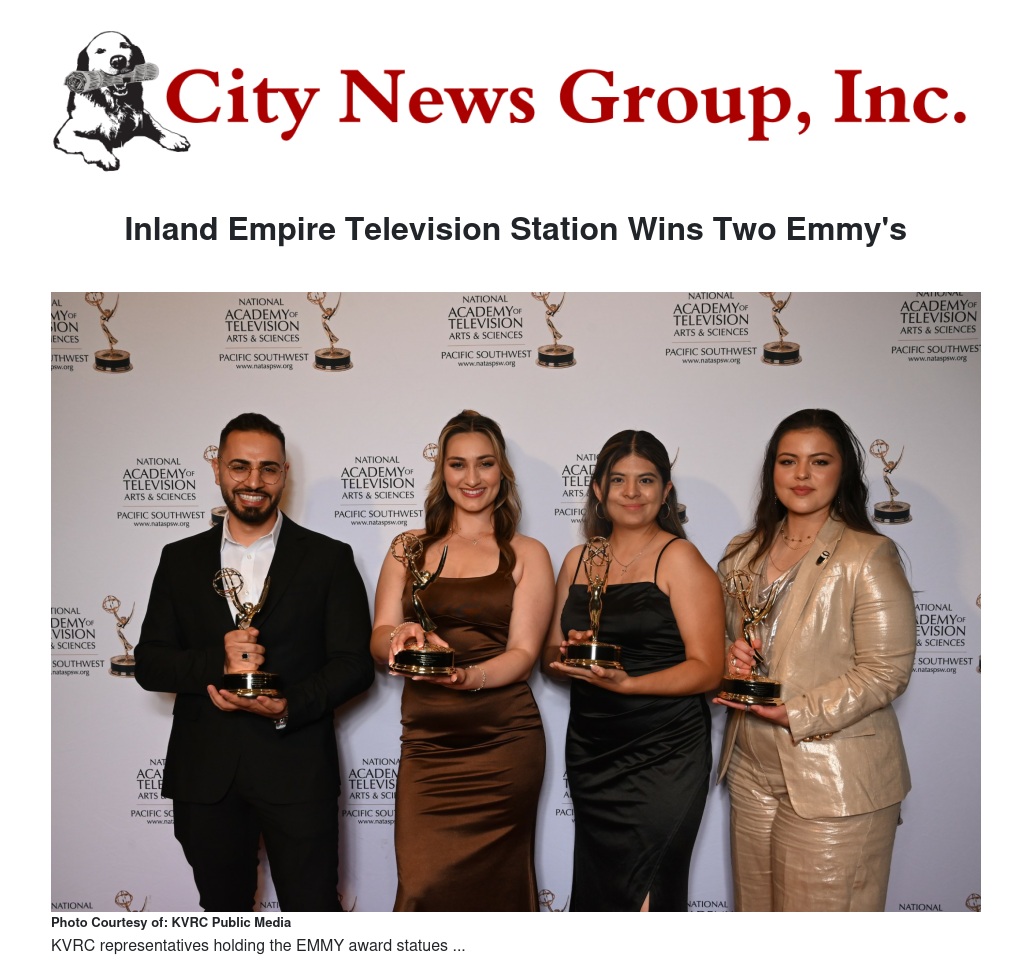 KVCR Public Media, the Inland Empire’s PBS Television Station (Channel 24) and NPR Radio Station (91.9 FM), is proud to announce that it has won two Emmy Awards, a remarkable recognition of the station’s commitment to telling meaningful, local stories that matter to our community. The first Emmy was awarded in the Documentary category for our original short series, The Warehouse Empire. Directed and hosted by San Bernardino-based filmmaker Sofia Figueroa, the powerful series examines the rapid growth of the warehouse and logistics industry across the Inland Empire. Through indepth reporting and firsthand community perspectives, The Warehouse Empire investigates the environmental, economic, and social impacts of this expanding sector, spotlighting issues often overlooked in mainstream media. “As the director of The Warehouse Empire, I'm deeply honored that our series received an Emmy award. Our goal was to spotlight the powerful stories of Inland Empire residents and bring attention to how the growing warehouse and logistics industry is affecting frontline communities. With the support of PBS stations like KVCR, we’re able to elevate local voices and bring greater visibility to the challenges and resilience within our community.” – Sofia Figueroa KVCR’s second Emmy was awarded in the Interview/Discussion – Short or Long Form Content category for an episode of its original series Inland Edition. The winning episode, Chris Burns: CEO, Boys Republic, features a heartfelt conversation with a leader making a profound impact on young lives in the region. Hosted by Joe Richardson, Inland Edition explores civic engagement through thoughtful interviews that give viewers insight into the people and issues shaping life in the Inland Empire. “As the showrunner, producer, and editor of Inland Edition, I was truly enlightened by the depth of insight shared by the civic leaders and public servants we featured. Receiving an Emmy is an incredible honor, but the real reward was learning firsthand how these individuals serve our communities every day. Our goal was to highlight the people behind the decisions that shape our lives—and I'm proud that Inland Edition resonated with viewers in such a meaningful way." – Brad Greenwell, Showrunner/Producer/Editor, Inland Edition. “We are truly honored to have won two Emmy Awards for producing local content that resonates deeply with our community,” said Connie Leyva, Executive Director of KVCR and Executive Producer for both projects. “Our mission as the PBS station serving the Inland Empire is to provide high-quality, informative, and engaging programming that keeps our viewers informed and connected. This recognition affirms our belief that local storytelling matters – and that the Inland Empire deserves a strong voice in public media.” These awards not only celebrate excellence in broadcasting but also reflect KVCR’s ongoing dedication to amplifying diverse voices and uncovering the real challenges and triumphs of the Inland Empire. Whether it's through investigative documentaries or engaging local discussions, KVCR continues to fulfill its public media mission: to educate, inform, and inspire.