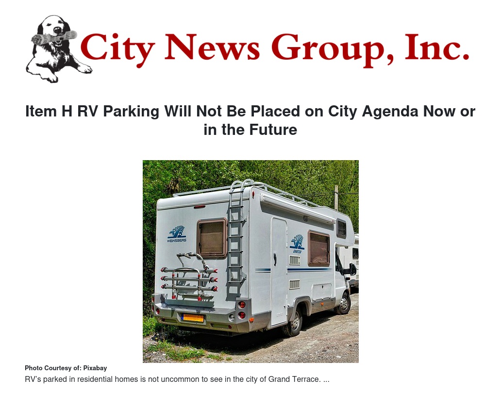 A resident of Grand Terrace for over 25 years, Scott Meinert, stated during public comment, “The ability not to have our RV storage will depreciate our home values. We do not live in a homeowner’s association with limited property rights… I love Grand Terrace, I’ve been active in this community, but my voice will not be silenced in this. Do not take our property rights away.”