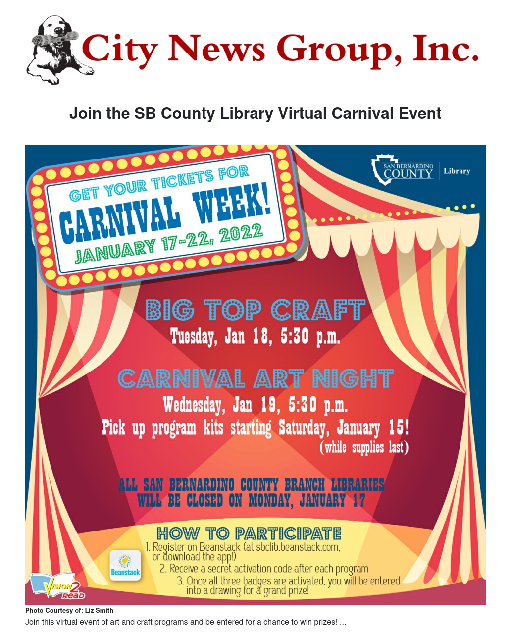 The San Bernardino County Library invites residents to join on Facebook and in the libraries for the Carnival Event. Enjoy an amazing week of virtual art and craft programs and earn two digital program activity badges on the library Beanstack app for the chance to win a fantastic themed prize basket.