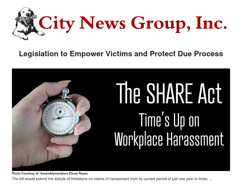Earlier today, Assemblymembers Eloise Reyes (D-San Bernardino), Laura Friedman (D-Glendale) & Marie Waldron (R-Escondido) alongside industry stakeholders and advocates in the “Me Too” movement, held a press conference to announce the introduction of AB 1870, the SHARE Act (Stopping Harassment and Reporting Extension) aimed at addressing the issue of harassment in the workplace.