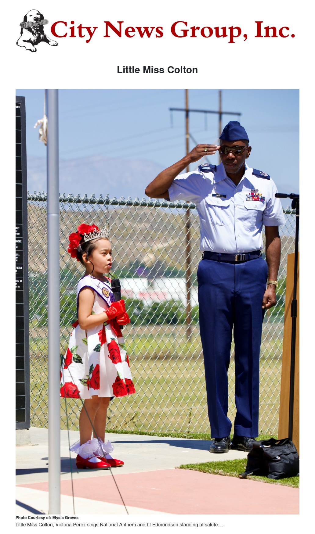 Victoria Perez may be small in stature, but large in voice and just six years old. She's a kindergartener at Terrace View Elementary School. She's active in athletics and represents the city of Grand Terrace as Little Miss Colton Princess. She is currently preparing to start her own charity called Victoria's Socks, with a goal of collecting 100 pairs of socks. I think it'll be clear she loves to sing. She's the daughter of Yvette and Randy Perez. Singing the National Anthem to all of those at the Grand Terrace Freedom Wall Memorial.