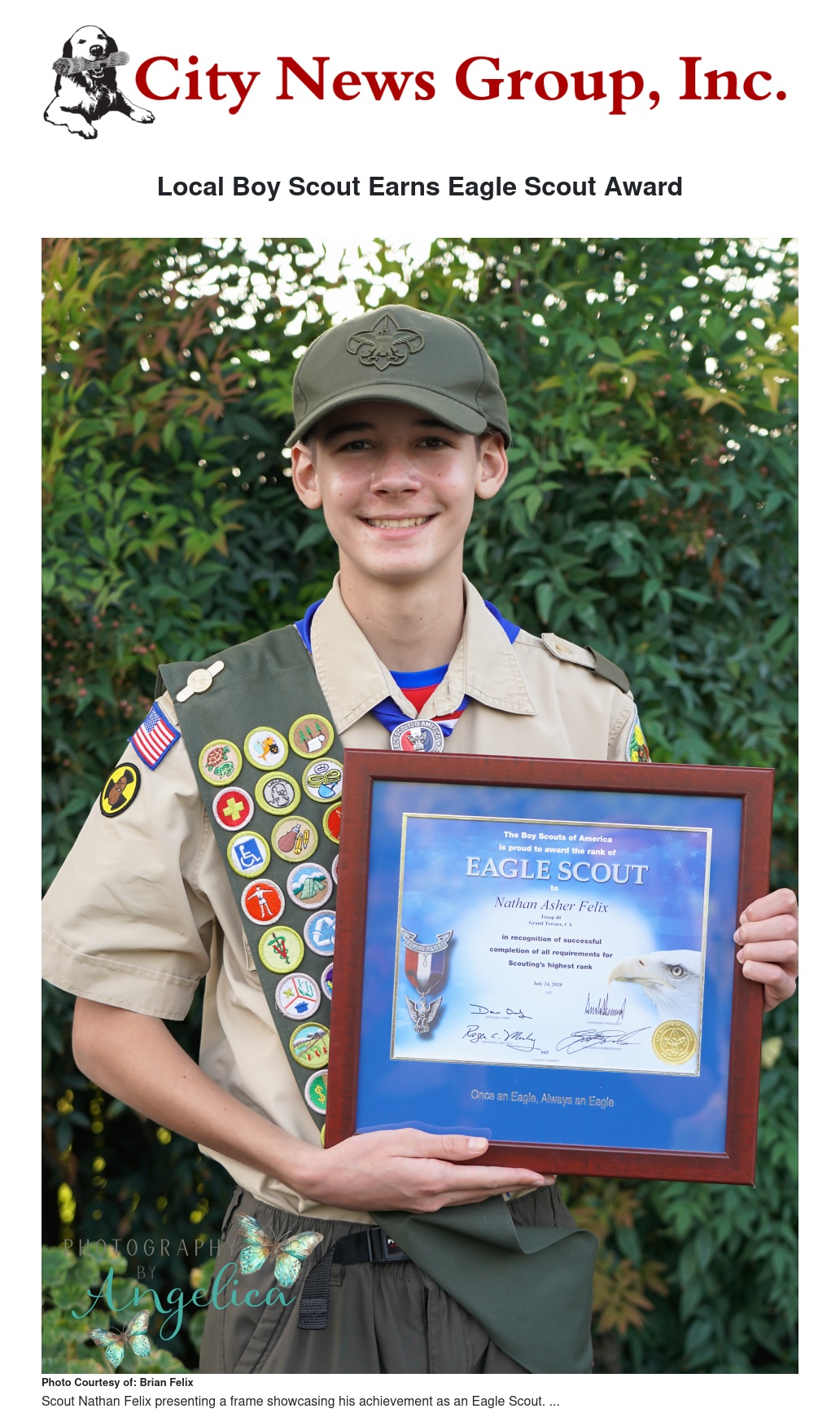At a small backyard COVID-19 compliant ceremony on Oct. 24, Nathan Felix, 16-year-old resident of Grand Terrace, was awarded Boy Scouts of America’s highest advancement award, the rank of Eagle Scout. Nathan is the son of Brian and Nicole Felix.