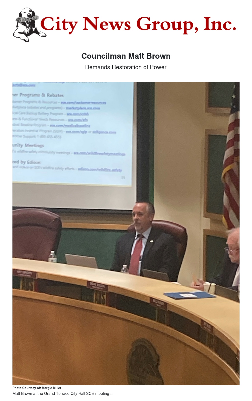 Brown continued “there has been a lot of talk about the Blue Mountain Senior Villas. But it goes beyond that. That's just the highly visible group of people in our community that are impacted. But to be without power for seven days when there's no wind is just unfathomable. I can't believe you guys are letting this happen. You mentioned the transmission project from the desert that brings in a renewable energy to our substation. Did you say that? That project actually increases our risk here in Grand Terrace.? If that transmission line were to go down it would be catastrophic. So that substation and the transmission lines being there are critically important. Across the region. The more utility infrastructure there is, the higher the risk; that's what I thought you said. To me that means I pay really high rates and I'm paying for that infrastructure that only increases my risk of my power being turned off. So despite what you said about restoration of power. I want to know what the timeline is for hardening the distribution lines in Grand Terrace, and I think that information should be shared with everyone in the city so we know when we can actually have some anticipation of when we'll have reliable power again.”