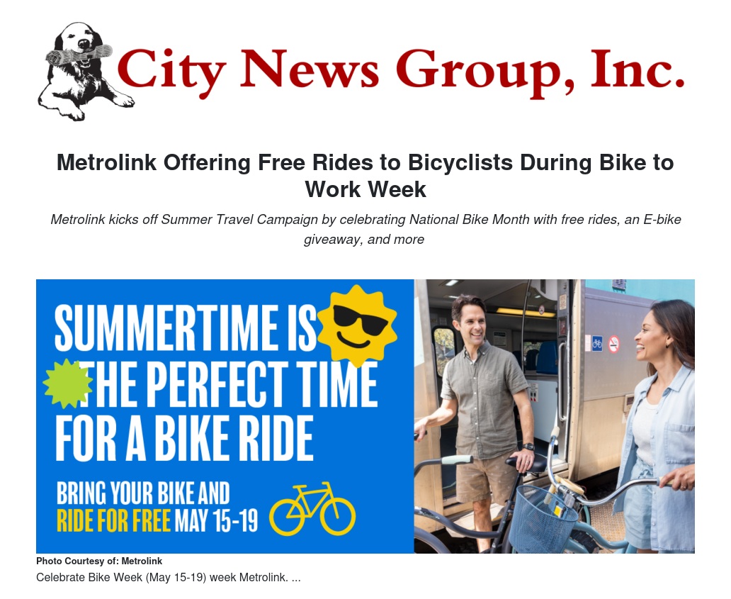Metrolink’s Summer Travel begins in May with a celebration of National Bike Month and free fare for riders who board trains with their bicycles during Bike to Work Week, May 15-19.